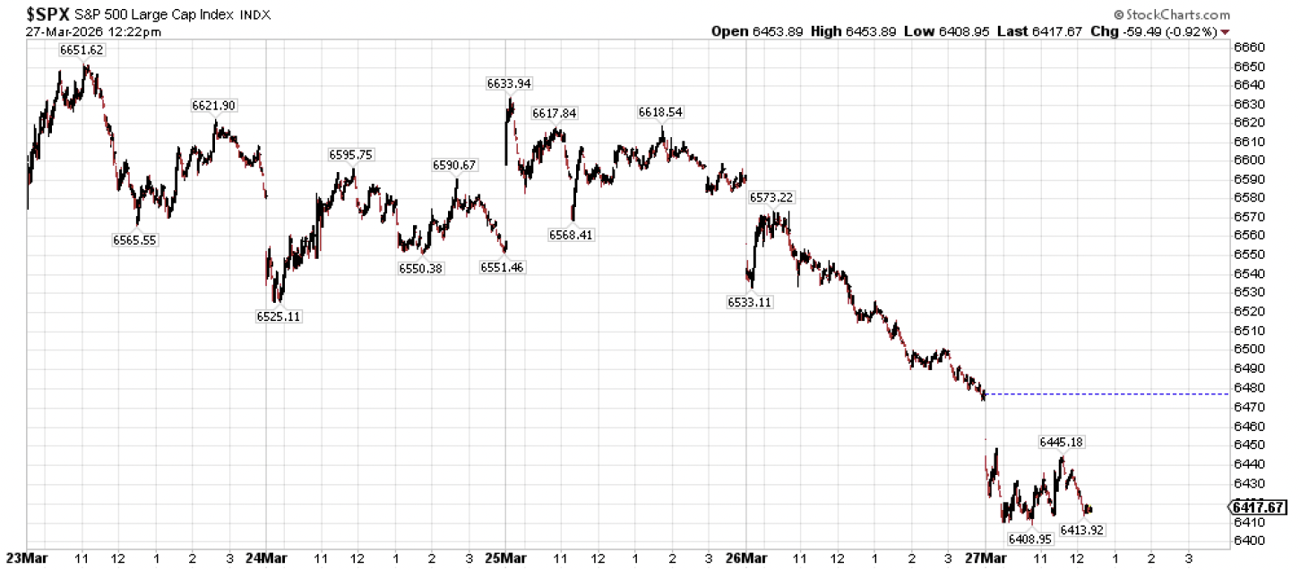 One final bonus point of reassurance – something in the yellow if you will.  The price of gold has also been getting hammered along with stocks since the start of the Iran conflict.  But after fifteen days of increasingly relentless downside in gold prices, we’ve seen gold catch a bid including a nearly +4% bounce today.  Short covering?  Perhaps.  But gold being up nearly +4% on a Friday when the S&P may be finding its footing is constructive as we head into the holiday week next week.