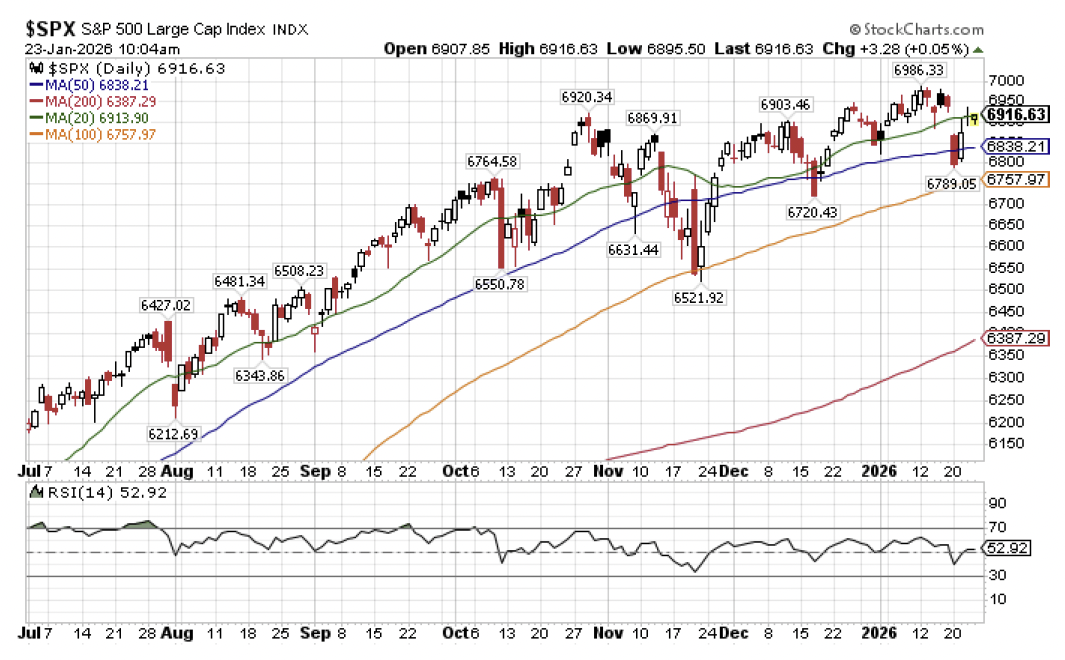 Frankly, my dear, I don’t give a damn.  Let’s consider the headline S&P 500 Index, the market cap weighted benchmark that is now roughly 50% allocated to the technology sector if you throw in a few of the leading former tech and tech adjacent names such as Alphabet (Google), Meta Platforms (Facebook), Amazon, Tesla, Visa, and MasterCard.  Does the psychologically important but otherwise meaningless 7000 mark remain frustratingly elusive?  Sure.  But the headline index is still trading marginally higher for the year to date, which can hardly be described as any form of market turmoil.  What about Tuesday when the S&P 500 along with its NASDAQ 100 counterpart plunged by more than -2% in the wake of the Greenland brouhaha over the weekend?  Gone with the wind, as stocks have rallied by more than +2% since, effectively wiping away the momentary blip.  We didn’t even retest the sharply upward sloping 100-day moving average, for goodness sake, much less see anything that could even be described as roiling capital markets.