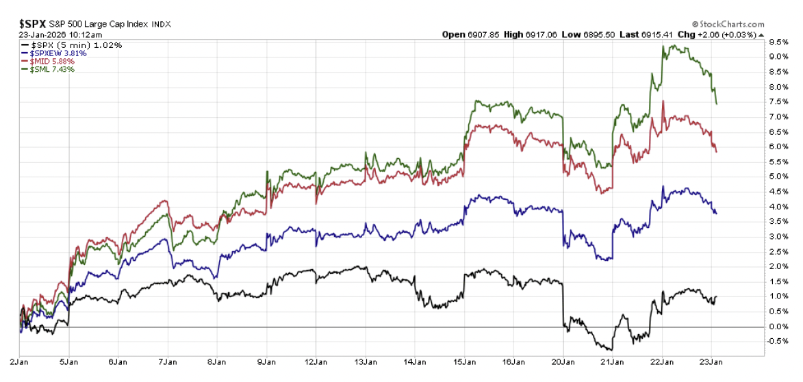 When looking at the equal weighted S&P 500 where tech ranks as the third largest sector at 13% of the index, it is already up nearly +4% YTD.  U.S. mid-cap stocks as measured by the S&P 400 are doing even better at nearly +6% higher so far in 2026.  What about long downtrodden publicly traded U.S. small caps that have been supposedly getting squeezed out by private equity in recent years?  Surging by as much as +9% in the first fourteen trading days of the year, which equates to something like +150% annualized for the year if this continues through the rest of the year (which of course it won’t, but if markets were truly being staggered by recent geopolitical news, we wouldn’t be talking about a more economically sensitive area of the market on track for triple digit returns so far this year).  With 61% of stocks within the S&P 500 outperforming the overall index so far this year, this is long anticipated broadening of market returns truly playing itself out.  Not only is this highly constructive for stocks going forward, but this is not necessarily a new development, as 52% of stocks in the S&P 500 have outperformed the overall index since the start of 2025 Q4.  This is broadening that is now four months in the making and coming in the context of a headline index that is continuing to press new all-time highs.  Very good stuff.